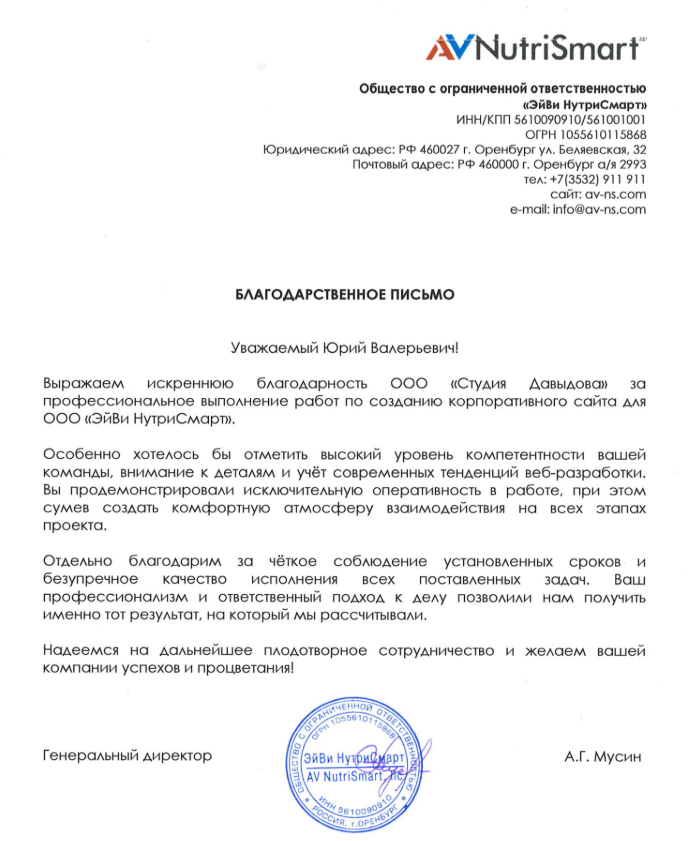 «Выражаем искреннюю благодарность ООО «Студия Давыдова» за профессиональное выполнение работ по созданию корпоративного сайта для ООО «Эйви НутриСмарт».»
