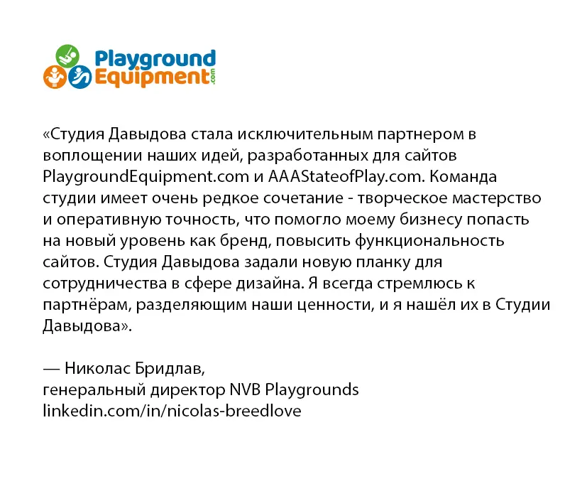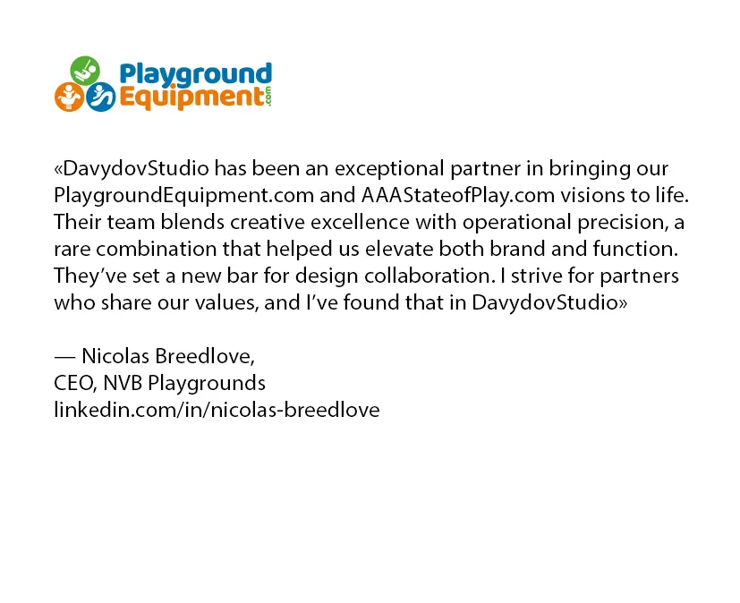 Студия Давыдова стала исключительным партнером в воплощении наших идей, разработанных для сайтов PlaygroundEquipment.com и AAAStateofPlay.com. Команда студии имеет очень редкое сочетание — творческое мастерство и оперативную точность, что помогло моему бизнесу попасть на новый уровень как бренд, повысить функциональность сайтов.